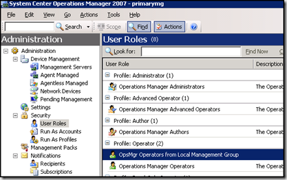 To grant users in the local management group rights to view data from the connected management group open the OpsMgr console of the local management group, go to the administration node and expand security and click User Roles. In the detail pane right click the user role you want to grant connected management group access to and select properties.