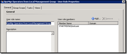 In my example I have created a custom operator user role called 'OpsMgr Operators from Local Management Group' and have added my testuser account to the role.