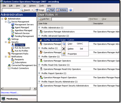 In my example I have created a custom operator user role called 'Opsmgr Operators Scope - Custom' and have added the testuser account to it.