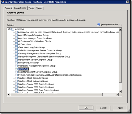 Use the Group Scope, Tasks and View tabs to configure the permissions that testuser will have to the connected management group. By default, full permission is allowed.