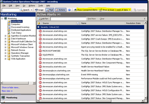 So now we have everything configured - so let's switch to the monitoring node in the OpsMgr console of the local management group to take a look at all of the new alerts that are visible from our connected management group.