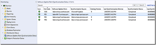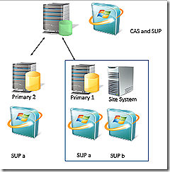 Configuring SUP’s to share a single SUSDB requires you to configure WSUS that way during install. From there the SUP is installed normally and the shared database is available through WSUS. The advantage of doing this is a reduction in the amount of time required to synchronize updates to the SUSDB at the primary. In a shared scenario the SUSDB will be updated by the master SUP – in this case SUP a (or the first one you install). Since SUP b shares SUSDB there is no need for the update to again be synchronized into SUSDB because it is already there. In the scenario where each SUP maintains it’s own SUSDB there would be a requirement to synchronize the update to each.