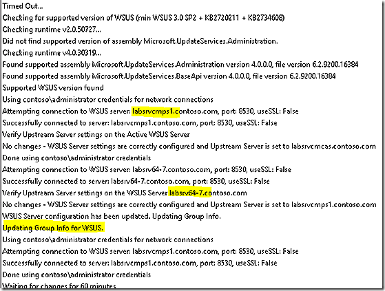 So the term master SUP isn’t just a figurative term, it’s the role SUP a actually plays. We see in this logs that the health of both SUPs at the site is being checked and also that we update a WSUS Group with the results. In my case there are no changes so nothing to update. If we had found a SUP with problems of if a new SUP had been checked for the first time then the membership of the group would have been adjusted accordingly.
