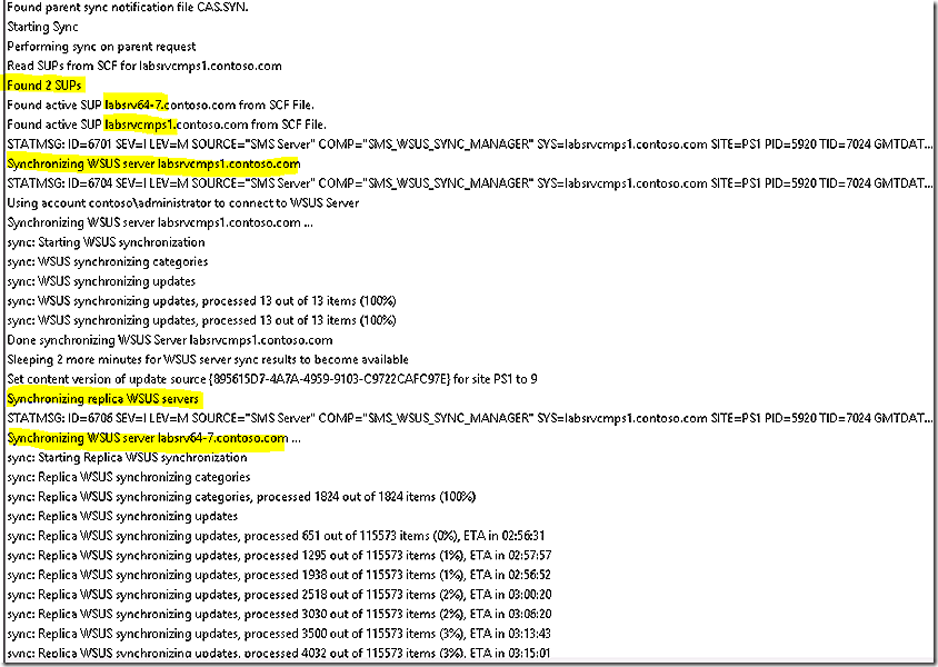So this log should look familiar because it is much the same as what you would see with just a single SUP. Note the differences though. First, we detect that there are two SUPs that need to be synchronized. Next we go through and synchronize the master SUP from the CAS – in this case there isn’t much to do because it has been synced recently. From there we start to sync our replica servers – in this case SUP b. This is a brand new SUP so we need to go through the entire sync process. If SUP b had been configured to use the existing SUSDB we would still see WsyncMgr go through the motions but there wouldn’t be anything to do as the updates are already there.