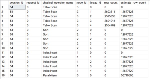 sys.dm_exec_query_profiles will give you statistical information of the progress of every operator in the execution plan and if the plan executes in parallel then it will give you the statistical information by thread.