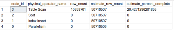 One of the challenges for DBA's are to work on heavy load and critical systems where maintenance windows are usually very short, recently I was asked for a customer if there was any possibility to track or estimate the progress of a CREATE INDEX statement and my response was sys.dm_exec_query_profiles .
