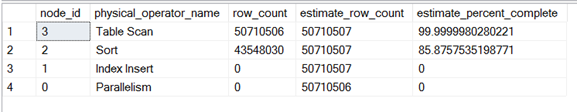Then you can view the progress of the CREATE INDEX statement and by doing so you can estimate the completion time under an equal base line of operation. Keep in mind that the output of the DMV is based on the execution plan generated by SQL Server, consider that the statistics are very important in the estimation of the retrieved records and that the order of the operations are determined by the execution plan too.