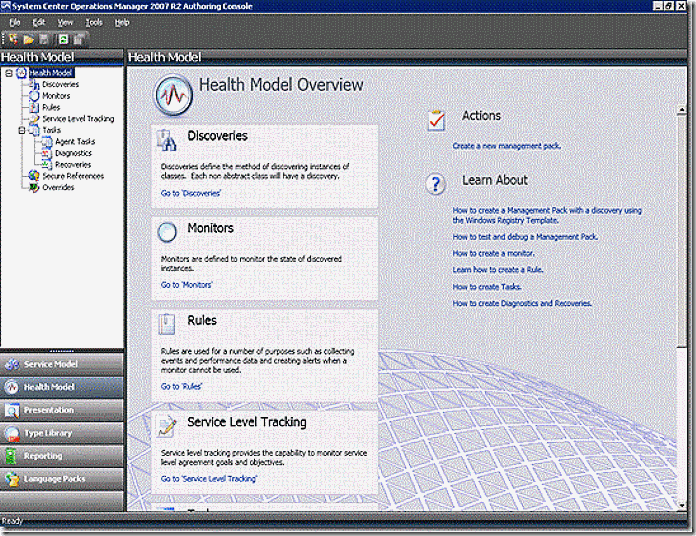 Creating the management pack should have placed the focus of the authoring console on the ‘Health Model’ node. If it didn’t, select that now. Before continuing let’s make one adjustment to the authoring console that will help us keep track of management pack versions. From the menu select Tools > Options. This will bring up the screen below. Select to ‘auto-increment’ the management pack version. When importing management packs with changes you should ensure the version number reflects that ther is a revision but it’s easy to forget to do so. Setting this option in the authoring console ensures you don’t forget!