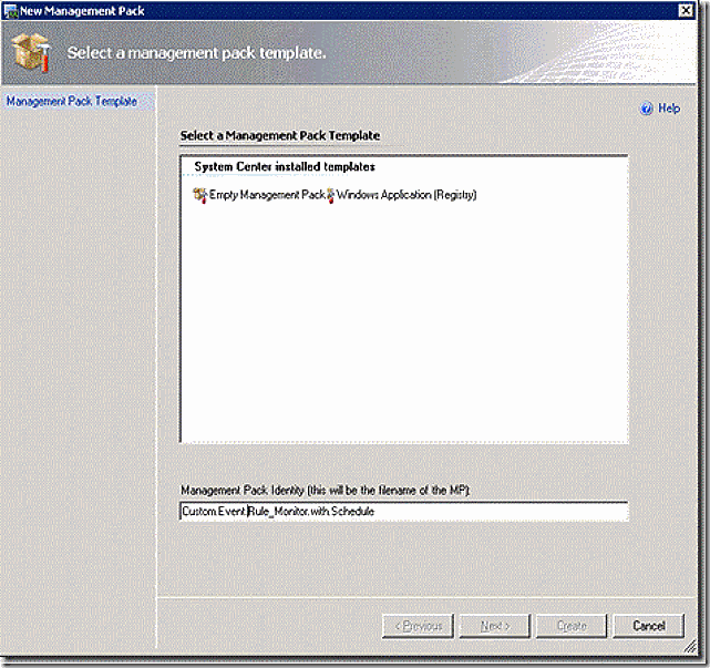 Enter a display name for the management pack – this will be the name of the management pack as seen in the OpsMgr UI. Once entered, select empty management pack and then select create. This will create the new management pack and make it ready for editing.