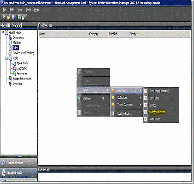 OK, on to authoring. We will start with rules. In the Health Model pane click on rules and then in the center rules pane, right-click and select New > Alerting > Windows Event