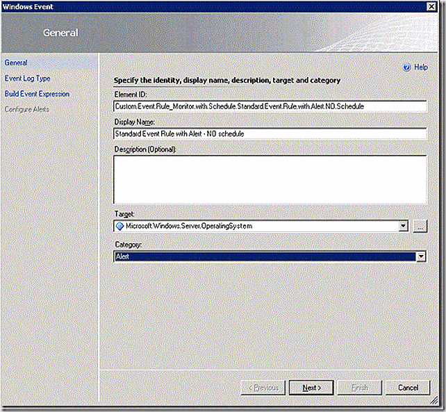 On the general tab of the Windows Event wizard that comes up, supply the element ID – which is the internal ID of the event, the Display Name – which will be displayed in the OpsMgr UI, the target and the category. Click net to proceed.
