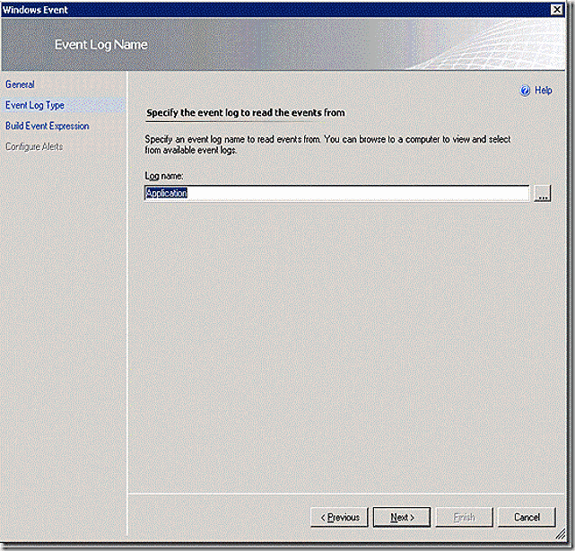 On the Event Log Type page of the wizard, choose which event log contains the event of interest. For our example we will use the application log – select it and click next.