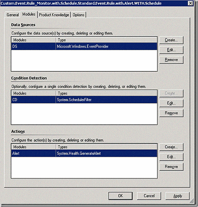 In case it’s not obvious from the screen shot – note that there are no tabs to allow editing the event log, event ID or alert properties. What the wizard did was create MODULES and plug them into the rule where required. The section of the wizard where we configured to use the application log and to look for event 1001 (remember, we are looking at the properties of rule 2) actually created a data source (DS) module leveraging the built in Microsoft.Windows.EventProvider component. There are lots of other Data Sources but the one selected is the one needed to pull information from the event log. If you were to edit the Data Sources section you could edit these settings. Further, creating the alert in the wizard caused an Actions module to get created and plugged in as shown leveraging the built in System.Health.GenerateAlert component.