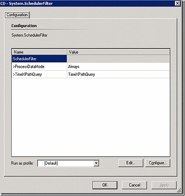 There is one more thing we need to do for our scheduled rule in order for it to work. Boris points this out on his blog which is where I discovered it! There is a bug in the authoring console where a needed snip of XML is not added. Back at the main schedulefilter window, select edit to pull up the XML section we need to modify.