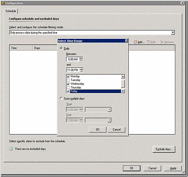 After selecting OK a screen should appear allowing you to configure the new filter. This is now very similar to what we did with our rule. Select configure and add a schedule where our monitor operates daily from 6:00 am to 11:00 pm as shown.