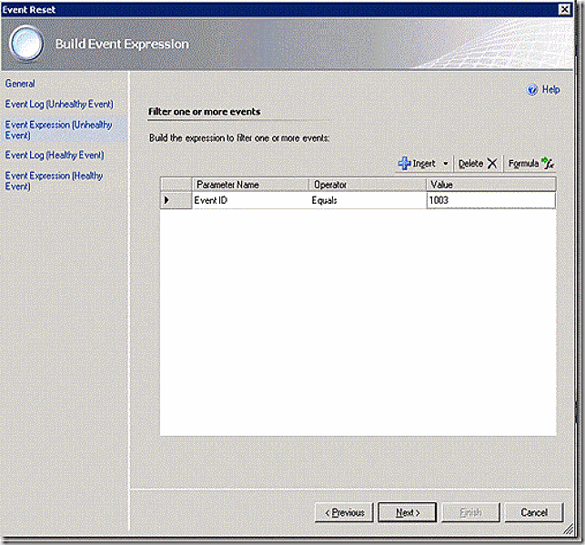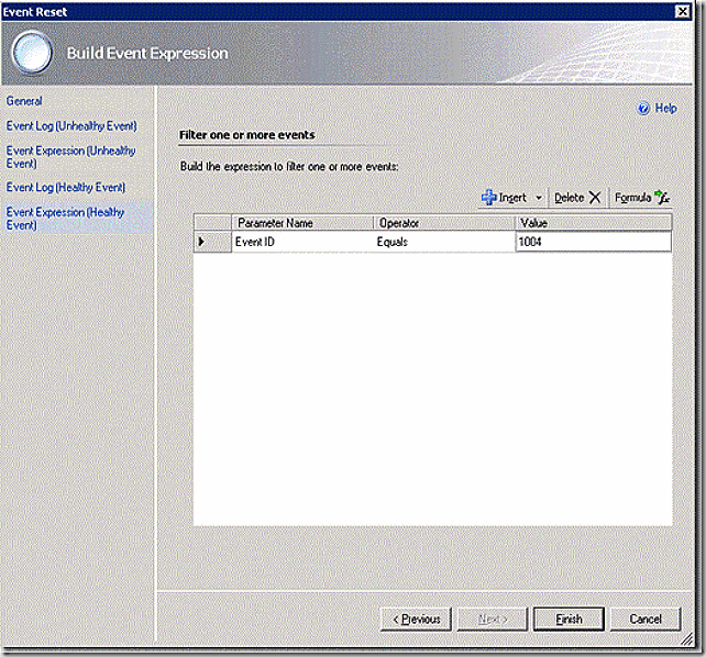 On the next two screens, configure the event log and event that will trigger state back to healthy. In this case, the application log and event 1004 and click finish.