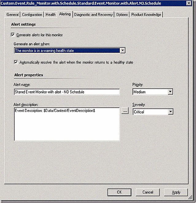 <UnitMonitor ID="Custom.Event.Rule_Monitor.with.Schedule.Standard.Event.Monitor.with.Alert.WITH.Schedule" Accessibility="Internal" Enabled="true" Target="Windows!Microsoft.Windows.Server.OperatingSystem" ParentMonitorID="Health!System.Health.AvailabilityState" Remotable="true" Priority="Normal" TypeID="Windows!Microsoft.Windows.2SingleEventLog2StateMonitorType" ConfirmDelivery="true">