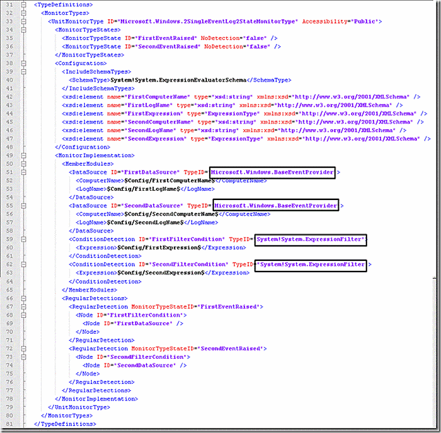The needed monitor type is in the microsoft.windows.library management pack (we know this because of our references) – open that system management pack (which will require you convert it to readable XML – Kevin has a good blog on how to export management packs here . The Monitor Type of interest, Microsoft.Windows.2SingleEventLog2.StateMonitorType is shown from the microsoft.windows.library management pack.