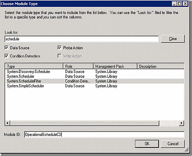 Staying with the member module tab, this is where we need to add a module to handle scheduling of our monitor. Select add and enter schedule in the look for box. Notice that 4 options match the schedule filter. Which one should we pick? Looking at the role for each option the answer is quickly clear – we are building a condition detection schedule filter so we will choose the condition detection filter – and there is only one. Once selected, enter OperationalScheduleCD as the module ID and select OK.