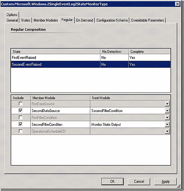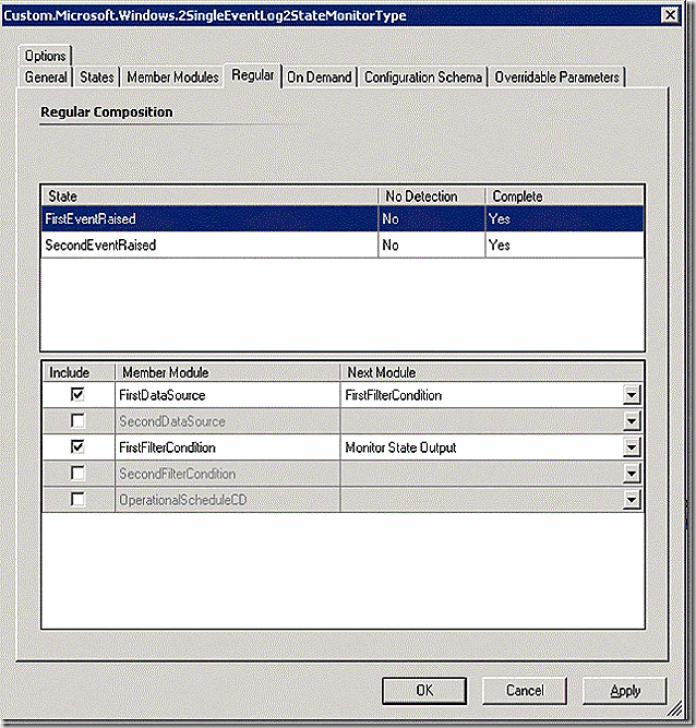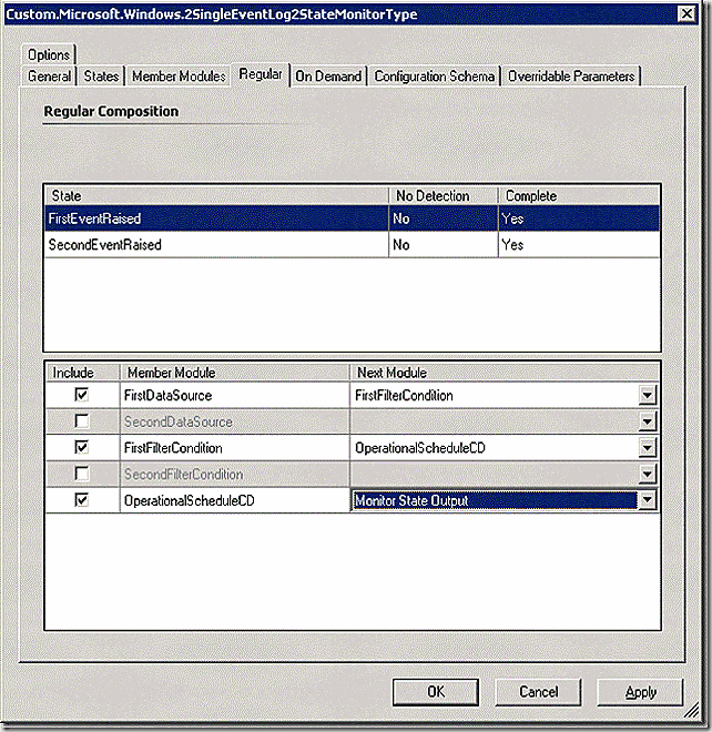 The member module tab is where things get interesting. This is where all of the modules that make up our monitoring workflow are defined. We can see that our datasource and filter modules are defined. Let’s stop there for a minute. Notice that there are two data sources and two filter modules. Why? Because this monitor type is a 2 state event monitor – meaning that there are two event logs and two event ID’s that need to be evaluated. This, two data sources and two filters!