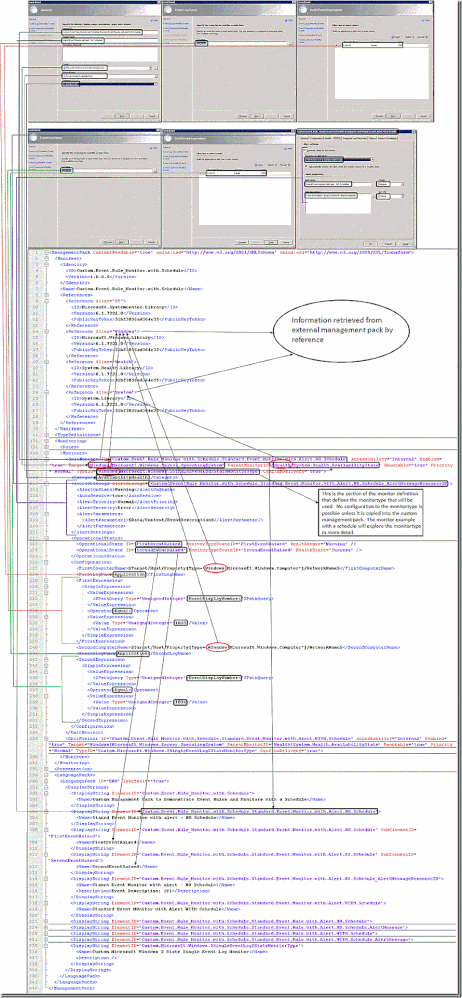 OK, thats enough to numb the senses – lets dig in a bit deeper! Now that we understand how to correlate a basic event monitor built in the UI to it’s resulting XML, let’s look at the XML that specifically ties a monitor to it’s monitortype and associated configuration. As shown above, monitortypes generally are defined in the system management packs and accessed by reference. For our scheduling example, we copied the needed monitor type and made some adjustments. Here’s how it all fits together. Note again that certain sections that aren’t applicable or that we have already covered are collapsed.