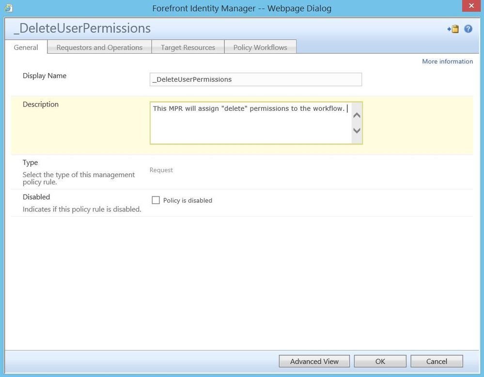 At this stage, however, this built-in workflow is lacking the necessary permissions to actually delete user objects, so these must be explicitly granted to it. To do so, we will make use of a permission granting management policy rule (MPR).