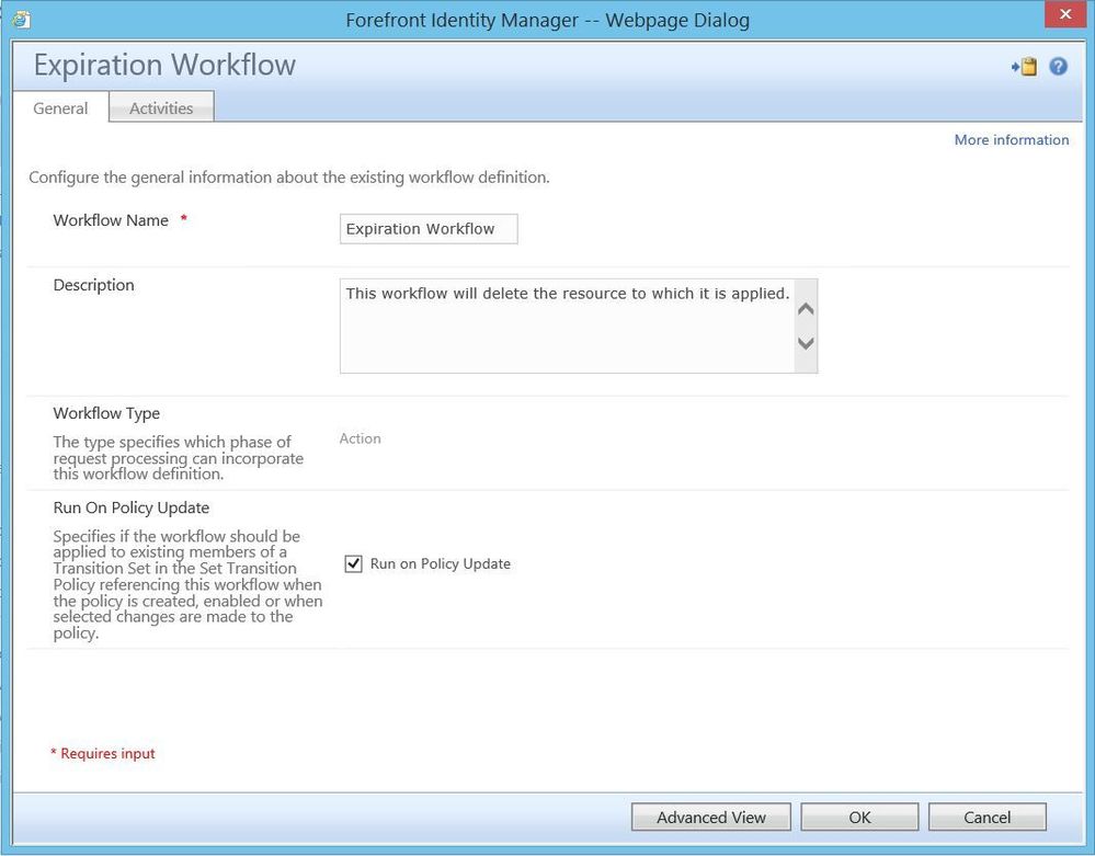 Here is a step that I urge you to use cautiously. There may be times when we wish to fire a workflow at a transition set that has already been populated with members. As there is no direct way to “re-transition” them, we need some way of simulating that step. One method of doing so (as shown in the below image) is by checking the “Run on Policy Update” box on the workflow itself. In doing so, we can disable/enable the associated MPR, which FIM will see as a “policy update”. I say to use this cautiously as FIM will detect any change to the MPR and, if this box is checked, fire the workflow against the set membership. As such, if you are not purposefully using this, leave this box unchecked as a safety measure.
