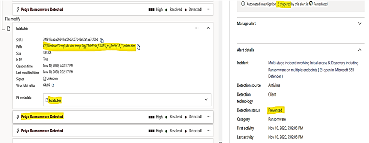 with " known ransomware infection" attack simulation , the following ransomware names are detected and alerted on test machine1: