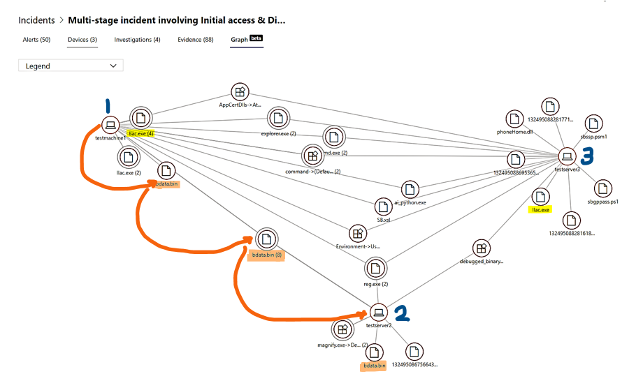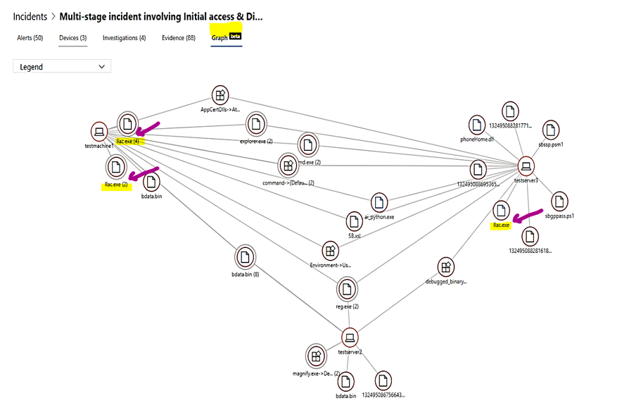 The ransomware attack overview and its entities are shown in the incident named “Multi-stage incident involving Initial access & Discovery including Ransomware on multiple Endpoints” tree graph,