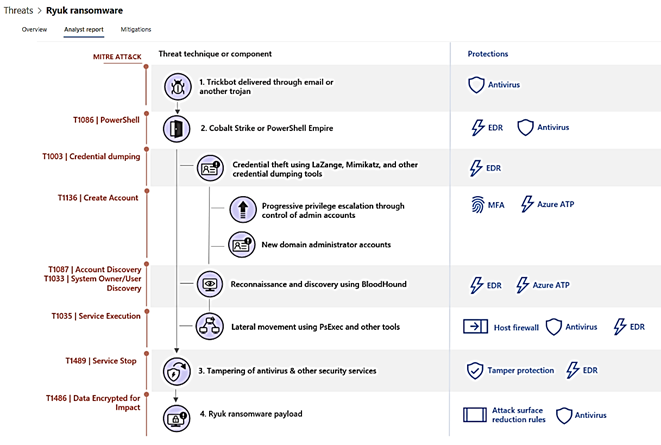 Microsoft Defender for Endpoint Analytics proposed an analyst report and mitigation (plan) against the Ryuk ransomware. Each of the attack step in Ryuk’s killing chain is mapped to the protection measures which include Antivirus-EDR (MD for Endpoint), Azure ATP (MD for Identity), Multi Factors Authentication MFA, Attack Surface Reduction rules for Office Macro, Windows Host Firewall, and Tamper Protection Security Policy.