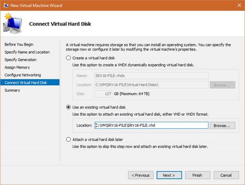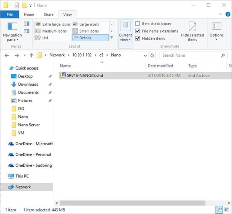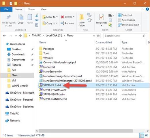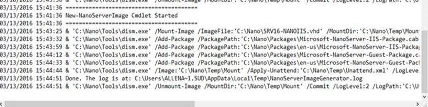 This first version is limited in roles in features. Future versions could have more capability. Image Creation Image creation is done by copying the Nano server install directory to your workstation, along with a PowerShell module and script used to create the images. By default, the images created with this module and script are VHD images. There are a couple of ways of installing a Nano server to physical hardware, one of them is to image a WIM file to a hard drive of the physical machine. I found a great blog by a Microsoft colleague, Refaat Issa, that details the procedure for creating a WIM as well as had a PowerShell module that he created to accomplish the creation: · Deploying Nano Server to a Bare-Metal Machine using a WIM and WinPE From < http://blogs.technet.com/b/nanoserver/archive/2015/12/01/deploying-nano-server-to-a-bare-metal-machine-using-a-wim-and-winpe.aspx > I will have more information and procedures later in this post on installing to physical hardware. Download the Windows Server 2016 Technical Preview media: · Windows Server Technical Preview 4 Evaluations From < https://www.microsoft.com/en-us/evalcenter/evaluate-windows-server-technical-preview > What I usually do is create a directory on my computer named C:\Nano. I then copy the module and script from the install media to that directory and the module downloaded from Mr. Issa's blog. I also create a separate directory named C:\WINSRV2016TP4 and copy the contents of the install media to that directory. Now that you have everything you need, open up a PowerShell Windows as an Administrator or open the PowerShell Integrated Scripting Environment. I like to use the ISE because it allows me to run snippets of scripts and commands as well as open remote PowerShell windows. If you haven't used it before, I encourage you to try it. The very first step is to go to the Nano directory where you copied the scripts and modules and import the modules so that you can create the images: Before you start generating images, you have to figure out what you want in the image as far as roles and features, you then build the command based on those options. For example, if I wanted to generate a Nano Server image that had the Hyper-V role, clustering, a static IP address, OEM Drivers, and join the Active Directory domain, you would use the below process to create the command. Declare variables and build command: $mediapath = "C:\WINSRV2016TP4" $basepath = "C:\Nano" $targetpath = "C:\Nano\SRV16-DEMO.vhd" $computername = "SRV16-DEMO" $domain = "sudbringlab" $interface = "Ethernet" $ipv4address = "10.20.1.30" $ipv4mask = "255.255.255.0" $ipvgateway = "10.20.1.1" New-NanoServerImage -MediaPath $mediapath -BasePath $basepath -TargetPath $targetpath -ComputerName $computername -OEMDrivers -Clustering -EnableRemoteManagementPort -DomainName $domain -InterfaceNameOrIndex $interface -Ipv4Address $ipv4address -Ipv4SubnetMask $ipv4mask -Ipv4Gateway $ipvgateway When the command is executed, it will prompt you for the administrator password for the local administrator account for the image. It then generates the image based on the options in the command: I declare variables and then chain the variables into the command, it makes it a little easier to reuse commands by just changing the variables. I am also enabling the remote management port on the VHD so that the server can be managed with PowerShell as soon as it boots. This command also harvests a domain blob for my AD domain, sudbringlab.com, and does an offline join of the machine to the domain. The TechNet Article "Getting started with Nano Server" has more options for the image command as well as other information on Nano server. · Getting Started with Nano Server From < https://technet.microsoft.com/en-us/library/mt126167.aspx > Later on in this post when we get to the installation of the server, I will be expanding on some of the options in this TechNet article and showing their practical use. Part 3: Virtual Server Install You have this fancy VHD created from the steps in the previous section and you want to test this Nano Server thing out. The easiest and fasted way is to boot it up in a Virtual Machine. You can boot the Nano server VHD created with the script and module in Hyper-V, both server and the version included with Windows Client. The procedures for configuring Hyper-V to use the VHD is the same. First thing we need to do is create a VHD with the Hyper-V guest drivers and the options we want for the server. For simplicity, I'm going to generate a VHD with the file server role, DHCP, Domain Join, and the Hyper-V drivers. Declare Variables and build command: $mediapath = "C:\WINSRV2016TP4" $basepath = "C:\Nano" $targetpath = "C:\Nano\SRV16-FILE.vhd" $computername = "SRV16-FILE" $domain = "sudbringlab" New-NanoServerImage -MediaPath $mediapath -BasePath $basepath -TargetPath $targetpath -ComputerName $computername -Storage -GuestDrivers -EnableRemoteManagementPort -DomainName $domain Running the command generates a dialog box for a password. For the purposes of this install, I will use a simple password of P@ssword: When the image is done customizing, it will be located in the C:\Nano directory: When the process is complete, a log file is generated from the process in the local user profile. This log can be used to troubleshoot errors and issues with creating the Nano Server images. More information on the log file will be in the next part of this post: Once the process is finished, navigate to the C:\Nano directory and copy the VHD file to your Hyper-V server or workstation with the Client Hyper-V components installed: To boot the VHD in a VM, you have to create a new VM and then associate the VHD with the VM during creation. Open Hyper-V Manager and choose New->Virtual Machine: Click Next on the "Before you Begin" screen: Configure the storage location for the VM and the name and click next: Choose Gen 1 or Gen 2 VM. Choose Gen 2 if using a VHDX file and click next: Assign 