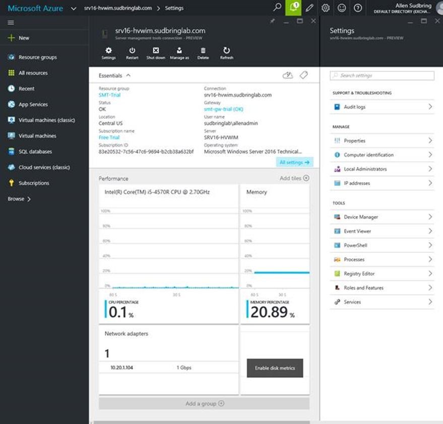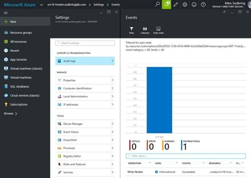 Introduction Hello Everyone! Allen Sudbring here, Platforms PFE in the central region. Today I wanted to share some information I have been working on with my customers concerning Microsoft's newest version of Window Server, Nano Server. Nano Server is a lightweight, stripped down version of Windows Server optimized for private clouds and datacenters. Nano server is our first version of Windows that has no shell and no user interface. Nano server is 100% remotely managed utilizing PowerShell and Server Manager. Part 1 - Console The only option available when logging into console of a virtual machine running Nano Server or connecting a crash cart to a physical Nano Server is this very plain emergency console: Not terribly flashy is it? After logging in, you are greeted with some very basic information about your server: From here you don't have a lot of options as far as very basic configuration of the server. You can restart and shutdown the server as well as Tab down to Networking and Firewall to change the IP address of the server and enable and disable rules in the built in firewall: Nano Server supports 64 bit tools, agents, and applications only. It is a very lightweight install and requires far fewer patches and updates than the server core or full version of Windows Server. Part 2 - Image Creation Prerequisites, Features, and Roles So how do I install this thing? Nano Server is unique as it's not "installed" like a traditional version of Windows Server. To install and configure a Nano Server, you first have to generate a VHD image that is configured to your specifications from the Windows Server 2016 install media. Before going any further, I need to put a disclaimer here: The information in this blog post was created using Windows Server 2016 Technical Preview 4, and may change when the product reaches RTM. There are a couple of prerequisites before you get started generating images for Nano Server: 1. Windows Server 2016 Technical Preview 4 Install Media 2. Windows 10 or Windows Server 2016 Technical Preview workstation to generate Nano Images. (Only required if harvesting domain blob to do offline domain join of image to Active Directory, more on domain join later) 3. Determine if Physical or Virtual Install 4. Configuration Options: a. Server Name b. IP address, gateway, and suffix (If not using DHCP) c. Roles d. Packages e. Domain Name (If doing offline domain join in image creation) The methodology for deploying a Nano server is a little different than deploying a traditional Windows Server. In the past, you deploy the server, configure it, and then install the roles, etc. for what the server would be doing. With Nano server, you do all that in the beginning when you're building an image for the server and then just boot it. You have to pick the roles and packages you want first, incorporate them, and then generate a VHD of the configured server. Point being, you don't want to miss a planning session when deploying Nano Server. As of Technical Preview 4, these are the roles and features supported on Nano Server: · Compute (Hyper-V clustered and stand-alone) · File server and storage host for Scale-Out File Server · DNS (File based only, AD Integrated not available) · Web Server (IIS with a default set of options. Packages can be added after install to enable more IIS features. More info here: https://technet.microsoft.com/en-us/library/mt627783.aspx · Containers (Windows and Hyper-V) Table showing options for image creation:
