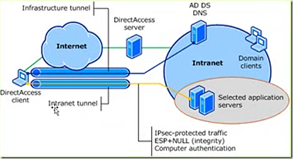 This scenario has the Direct Access client communicating through the internet to the Direct Access server. Note that there are two IPv6 protected tunnels created – one to access AD/DNS and the other to access application servers. This represents an ‘end to edge’ scenario