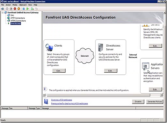 This is the key server for the Direct Access environment. There are two ways to configure Direct Access - simply install the component and configure it or make use of Forefront UAG Management. My preference is to make use of ForeFront. In Forefront we have an option for configuring Direct Access. When we select that option we have a layout for our Direct Access environment.