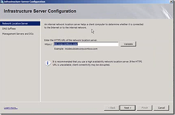Lastly is the configuration for Infrastructure Servers such as the network location server which helps determine whether the client is on the internet or intranet.