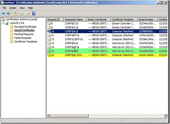 In addition to this we have the requirement for a certificate authority (CA). In this example the CA is installed on a domain controller. Looking at the CA we can see that all of the systems participating in Direct Access do have certificates. The yellow highlight shows one of my test Direct Access clients with a computer cert and the green highlight shows my Direct Access server with a web cert.