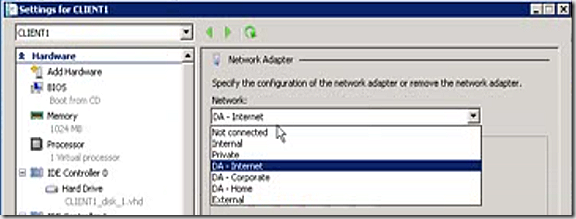 With the summary of the Direct Access environment complete, let’s see it work with SCCM. For my test client note that I have three Direct Access network configurations