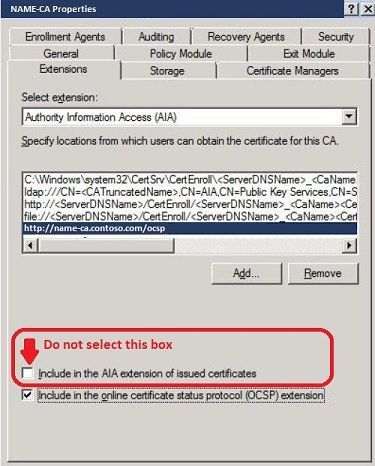 A common question from certification authority administrators is "Does Enterprise PKI (PKIView) support OCSP?" Yes, the Microsoft Management Console (MMC) Enterprise PKI ( PKIView ), supports the When setting up Certificate Extensions, you must ensure that the Include in the AIA extension of issued certificates is not selected . That option is located in the Extensions tab of the CA Properties in the Certification Authority console. The correct configuration for an http path specifying the AIA for an Online Responder is shown in the following figure. This question has also been added to the Active Directory Certificate Services FAQ at http://social.technet.microsoft.com/wiki/contents/articles/1587.aspx