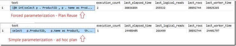 Looking at the query stats for the same query (passing parameter value 50532, utilizing forced parameterization for the first test and simple parameterization for the second test) during the different runs, we can see numerical proof that with simple parameterization (and in turn an ad hoc plan) gives us better execution statistics at the cost of no plan reuse: