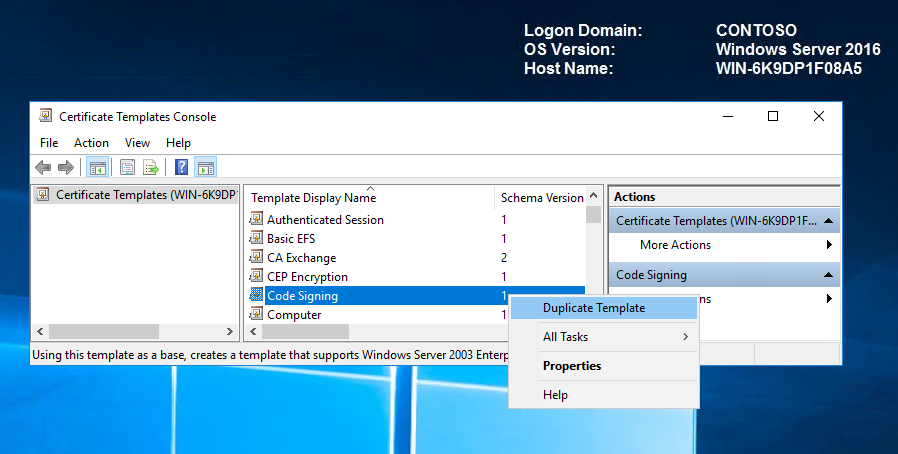 In the certificates template console, right click on the Code Signing template and click duplicate template.