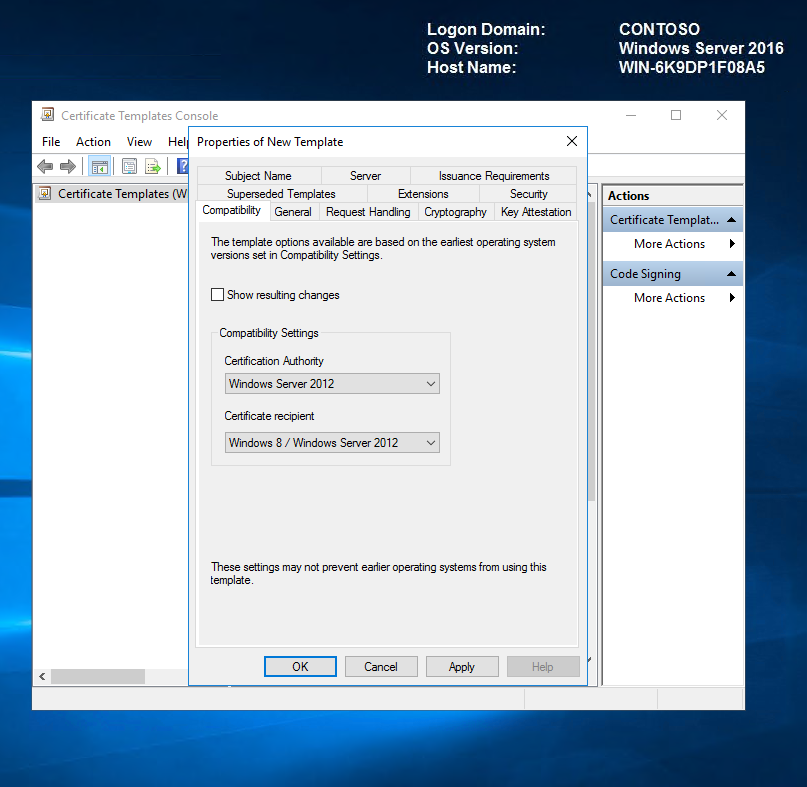 On the Compatibility tab, clear the Show resulting changes check box. Select Windows Server 2012 from the Certification Authority list, and then select Windows 8 / Windows Server 2012 from the Certificate recipient list.
