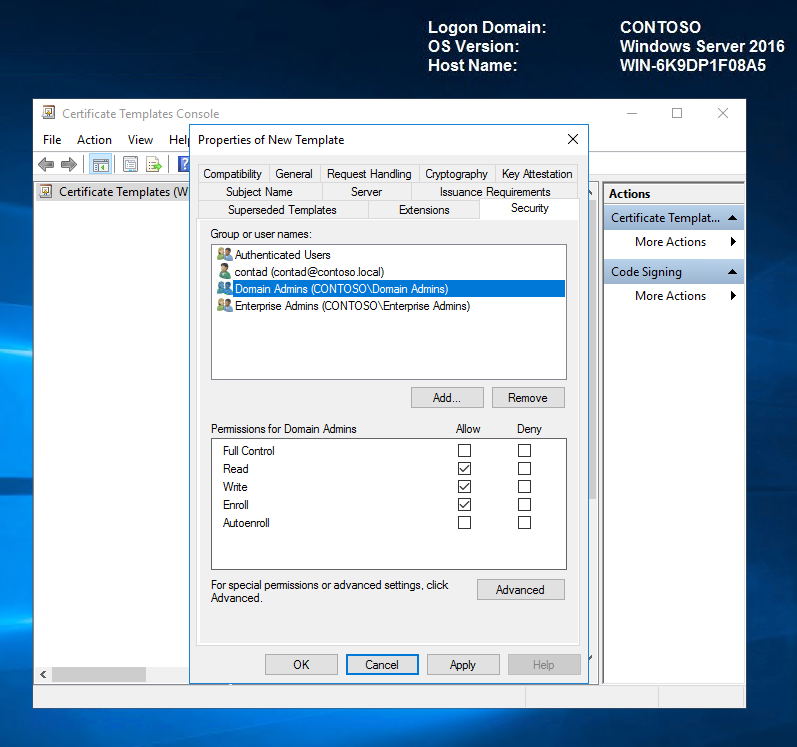 On the Security tab, verify that whatever account will be used to request the certificate has the right to enrol the certificate. We will leave the defaults but you can granulate as you see fit.