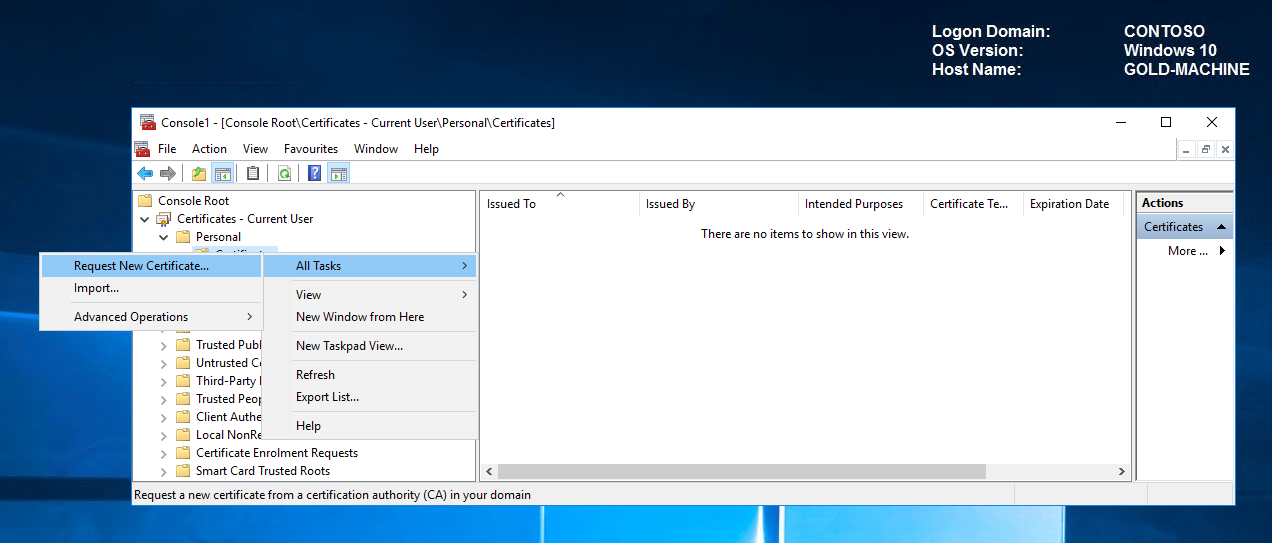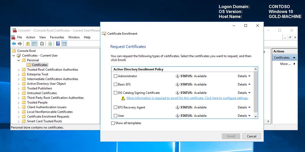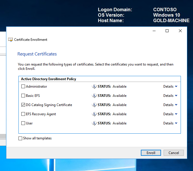 Now that the template is available to be issued, we must request one from the computer running Windows 10 on which we will create and sign catalog files, in our case, this will be our GOLD-MACHINE.