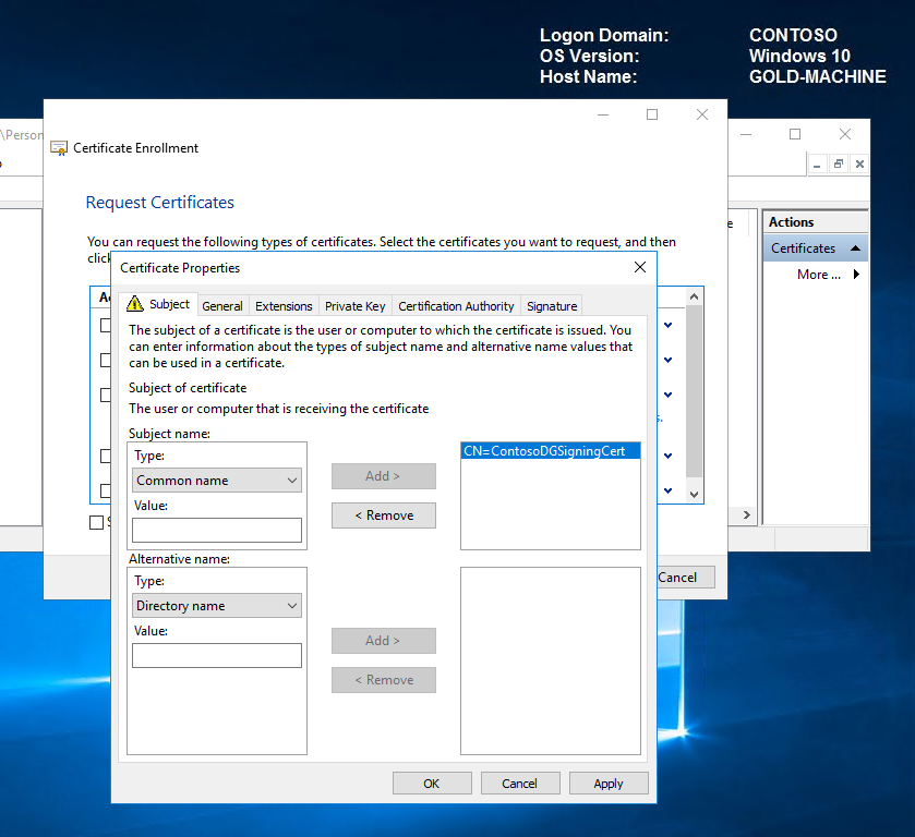 In the Certificate Properties dialog box, under Subject Name, for Type, select Common name. For Value, select ContosoDGSigningCert, and then click Add.
