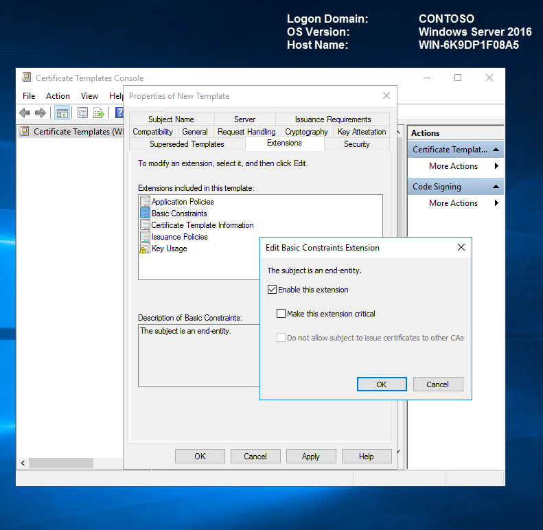 On the Extensions tab, select the Basic Constraints check box, and then click Edit. In the Edit Basic Constraints Extension dialog box, select Enable this extension.