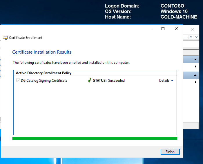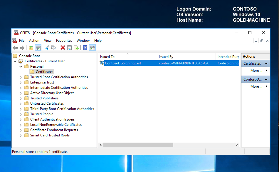 Note The certificate must be installed in the user’s personal store on the computer that will be signing catalog files and/or code integrity policies (in our case GOLD-MACHINE). Because the signing is going to take place on the computer that we just requested the certificate on, we don't need to export the certificate as it already exists in our personal store. If you are signing on another computer, you will need to export the .pfx certificate with the necessary keys and properties and secure using a strong password. When the certificate has been exported, import it into the personal store for the user who will be signing the catalog files or code integrity policies on the specific computer that will be signing them.