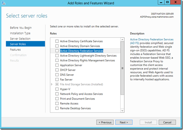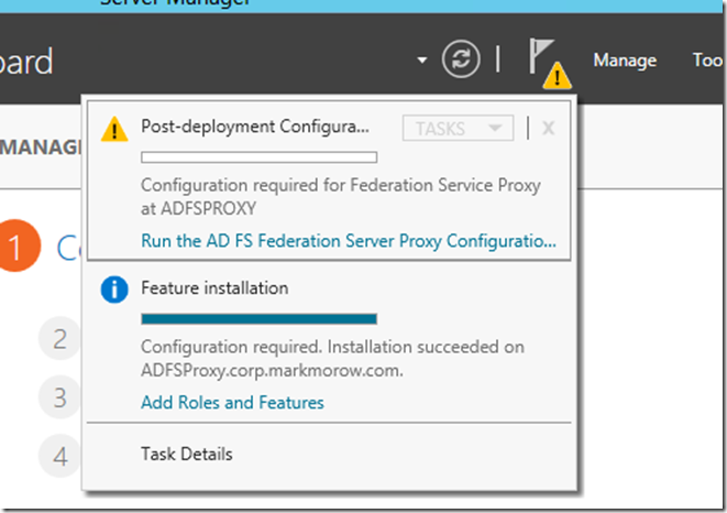 When you see how simple this is you will be ashamed it took me this long to write this post. You’ll have a machine that can be domain joined or doesn’t have to be as long as it can talk to the ADFS server on port 443. Since this is a test lab, I do have my ADFS Proxy joined to the domain. Start by click Add Roles and Features in Server Manager.