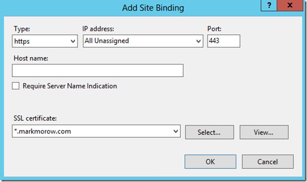 The next thing you are going to need to do is put an SSL cert on your ADFSProxy. This SSL name should ALSO match the SSL cert on your ADFS server. This shouldn’t be too much of a shock when you think about what role it’s providing. For external users or applications that are external, they are going to resolve the same ADFS service name, in my case sts.markmorow.com and it will connect to the proxy instead of the internal ADFS server. Which brings us to DNS. It’s up to the administrator to configure the internal DNS servers to point at the internal ADFS server and the external DNS servers to point proxy.