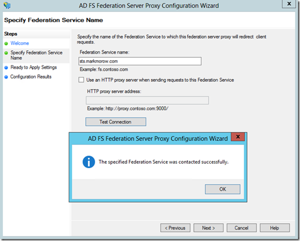You’ll add the federation server you want to connect to, remember your DNS configuration from before so you should be pointing to the INTERNAL adfs server, for me that will be sts.markmorow.com. You’ll then enter your domain credentials to establish the trust.